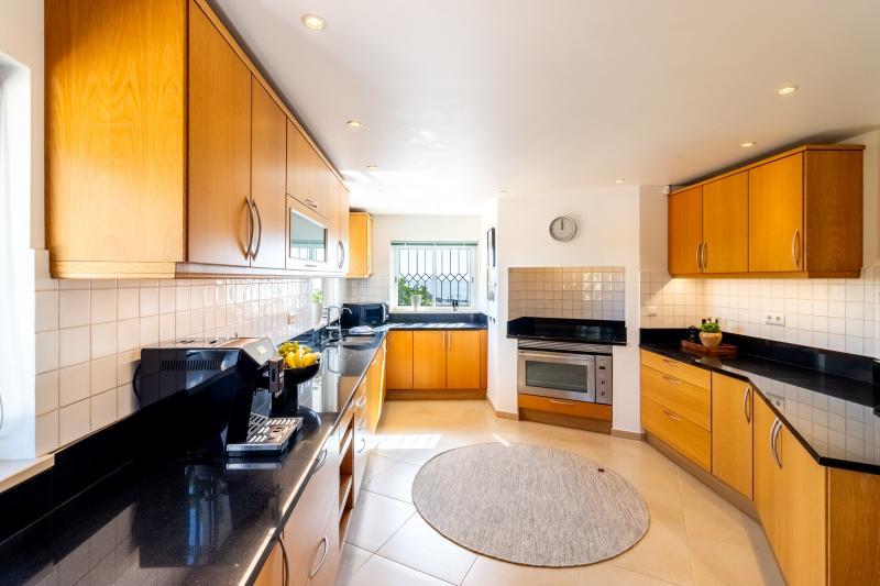Die zum Wohnbereich offene Küche ist vollständig mit hochwertigen Geräten ausgestattet, darunter ein Induktionskochfeld und ein extra großer Backofen.
