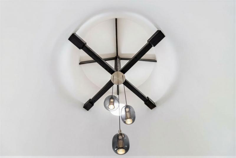 Freiliegende Holzbalken unterstreichen den architektonischen Charme und schaffen eine warme und stilvolle Atmosphäre.