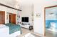 Das Wohnzimmer öffnet sich zudem zu einem Außenloungebereich und zur großzügigen Poolterrasse.