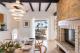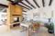 Wohn- und Essbereich sind durch eine elegante Natursteinwand mit beidseitigem Kamin dezent voneinander getrennt, was beiden Bereichen Wärme und Charakter verleiht.