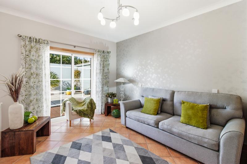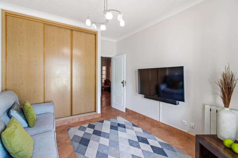 Von hier aus besteht direkter Zugang zum Vorgarten, der mit traditionellem portugiesischem Calçada-Stein gestaltet ist.