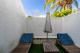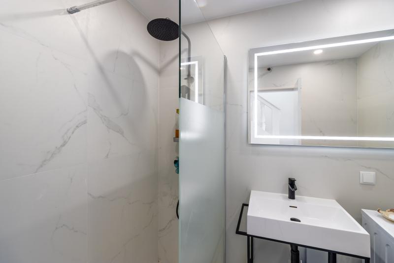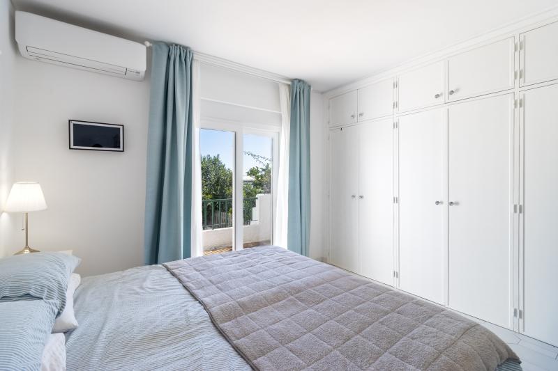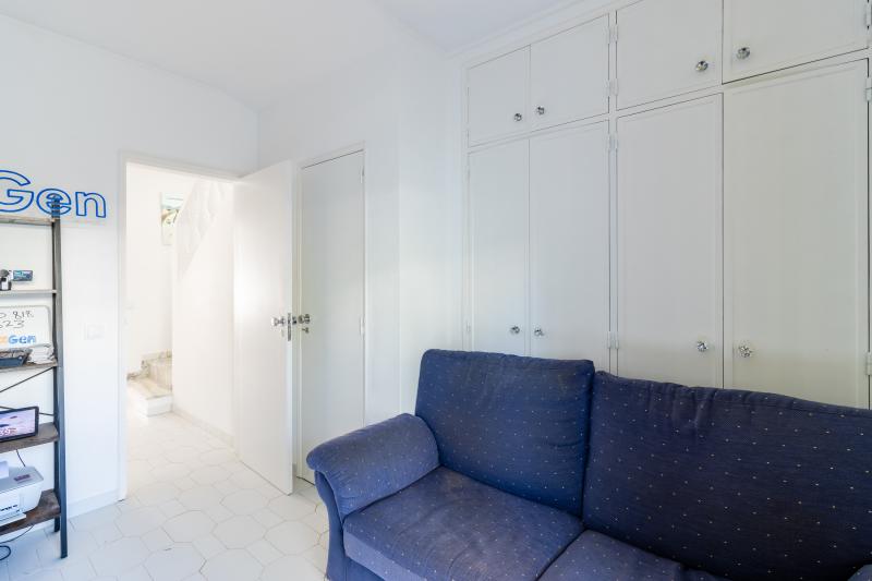 Im Erdgeschoss befinden sich die beiden Schlafzimmer. Das Hauptschlafzimmer öffnet sich direkt zu einem privaten Gartenbereich mit einem Tor für bequemen Zugang – ideal zum Entspannen im Freien oder zum einfachen Betreten nach einem Tag am Strand. Das zweite Schlafzimmer, das derzeit als Arbeitszimmer genutzt wird, verfügt ebenfalls über eine eigene Terrasse auf der Rückseite mit einer schönen Innenhofatmosphäre und bietet einen ruhigen und privaten Außenbereich. Auf dieser Ebene befinden sich auch ein Abstellraum sowie ein zusätzlicher Stauraum unter der Treppe, die für praktisches Wohnen neben Komfort und Stil sorgen.