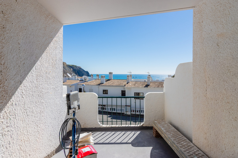 Der Eingang zur Wohnung befindet sich auf der oberen Ebene, wo ein heller, offener Wohn- und Essbereich einen einladenden Raum zum Entspannen oder für gesellige Anlässe schafft. Von hier aus führen Schiebetüren auf einen großzügigen Balkon mit herrlichem Meerblick, der sich perfekt eignet, um die Sonne der Algarve zu genießen.