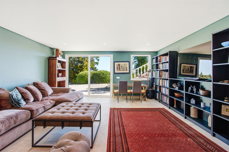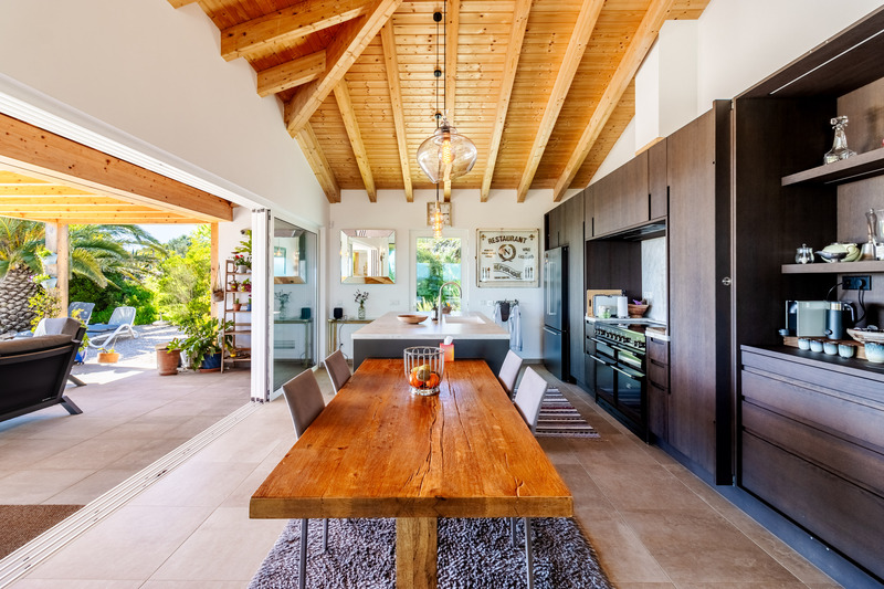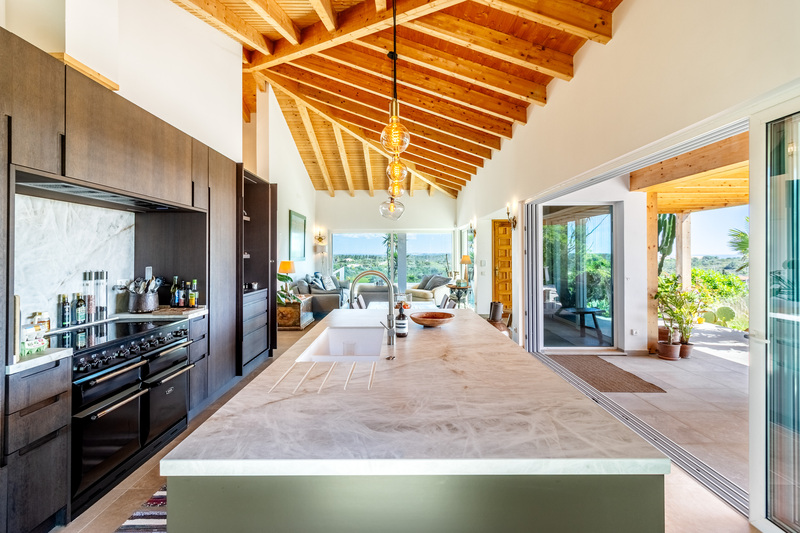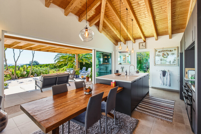 Das Herzstück des Hauses bildet ein spektakulärer offener Wohnbereich, in dem großzügige Schiebetüren den unverbauten Blick auf die Landschaft und das Meer einrahmen und den Innenraum mit natürlichem Licht durchfluten. Der nahtlose Übergang zwischen Innen- und Außenbereich wird perfekt ergänzt durch die wunderschön gestaltete, moderne Küche, die mühelos in den Essbereich übergeht und sich auf eine großzügige Terrasse erstreckt – ideal für gesellige Anlässe oder einfach zum Genießen der friedlichen Umgebung. Dieser gesamte Raum wird von markanten hohen Holzdecken gekrönt, die sowohl Raumgefühl als auch Charakter verleihen, während ein stilvolles Gästebad diese Etage abrundet.