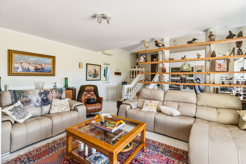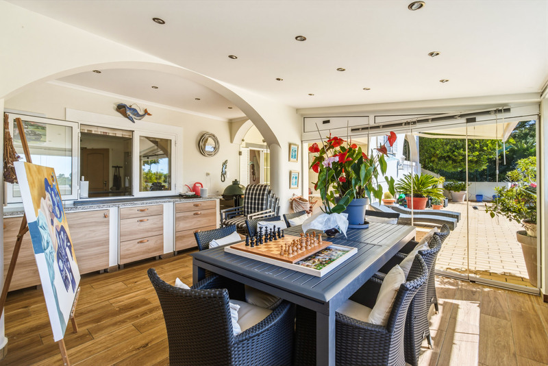 Der helle und lichtdurchflutete Wohn- und Essbereich öffnet sich zu einer erhöhten Terrasse mit herrlichem Blick auf den Pool, die Gärten, das Resort und das Meer in Richtung Salema.