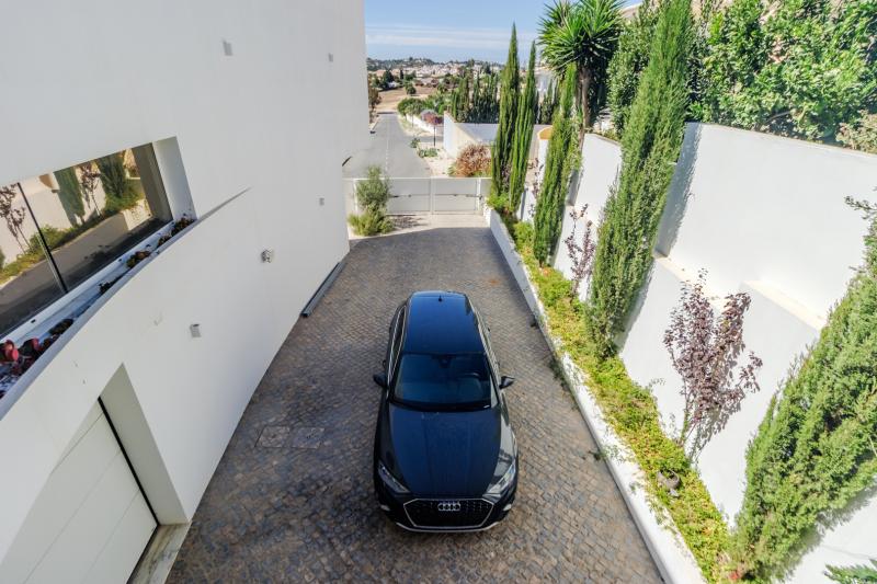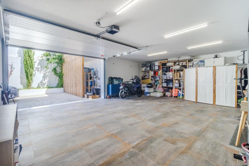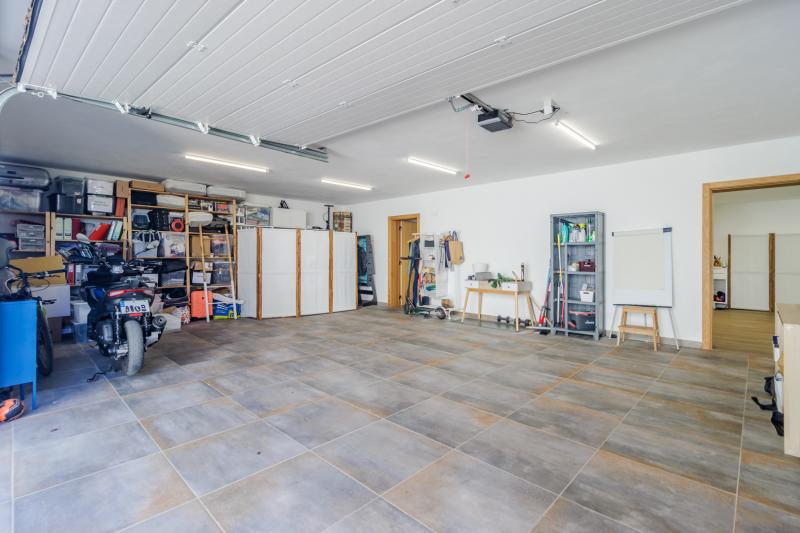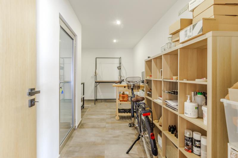 Through the electric gates, you arrive at the villa's ground floor, greeted by an inviting entrance hall with stairs leading up to the main living area. This level features a spacious bedroom with an en-suite bathroom, a versatile studio space perfect for a workout area or home gym, an additional bathroom, and ample storage. Towards the back of this floor, you'll find a double garage with a dedicated storage room and a laundry area.
