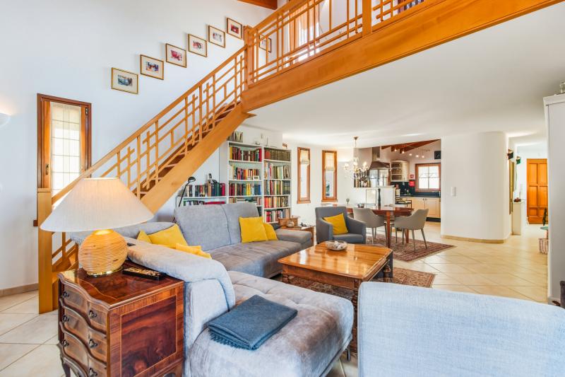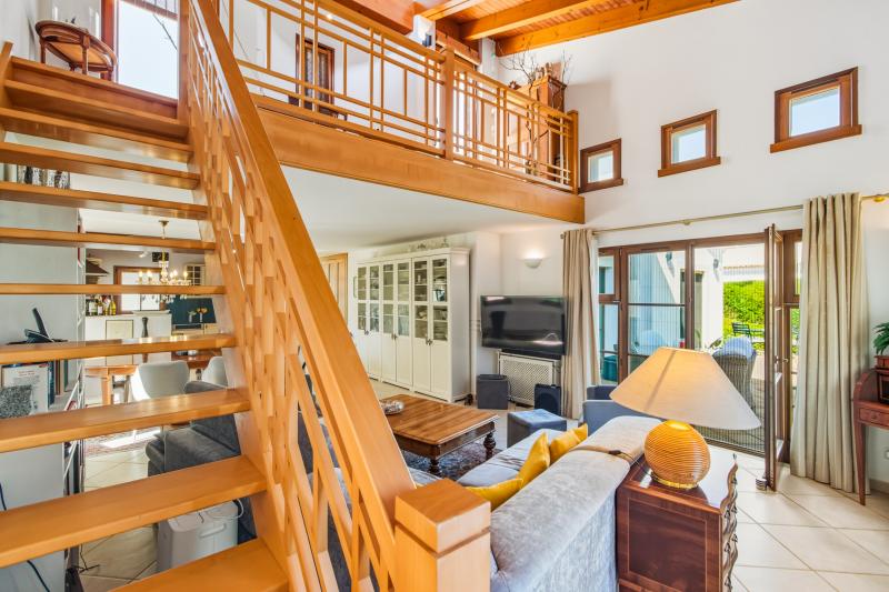 Dès l’entrée, un hall accueillant mène vers un lumineux espace de vie et salle à manger en plan ouvert, relié à une cuisine entièrement équipée — l’endroit idéal pour recevoir famille et amis. Une magnifique mezzanine en bois, accessible par un escalier élégant, offre un espace bureau supplémentaire et s’ouvre directement sur une grande terrasse.