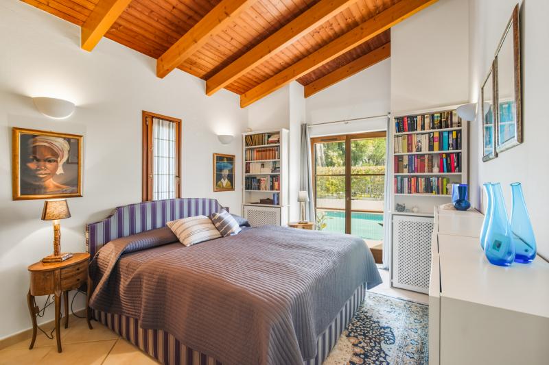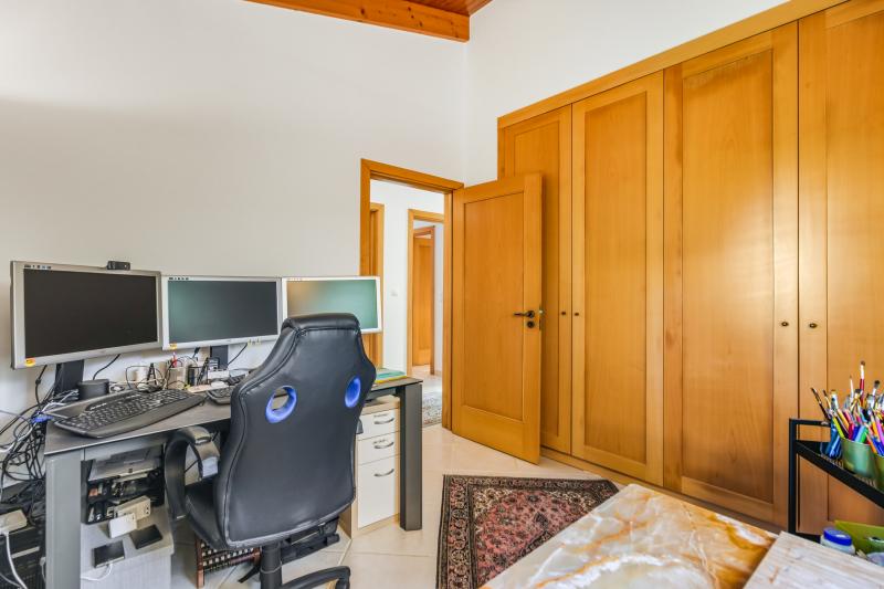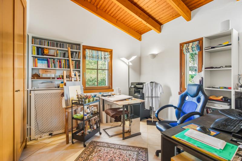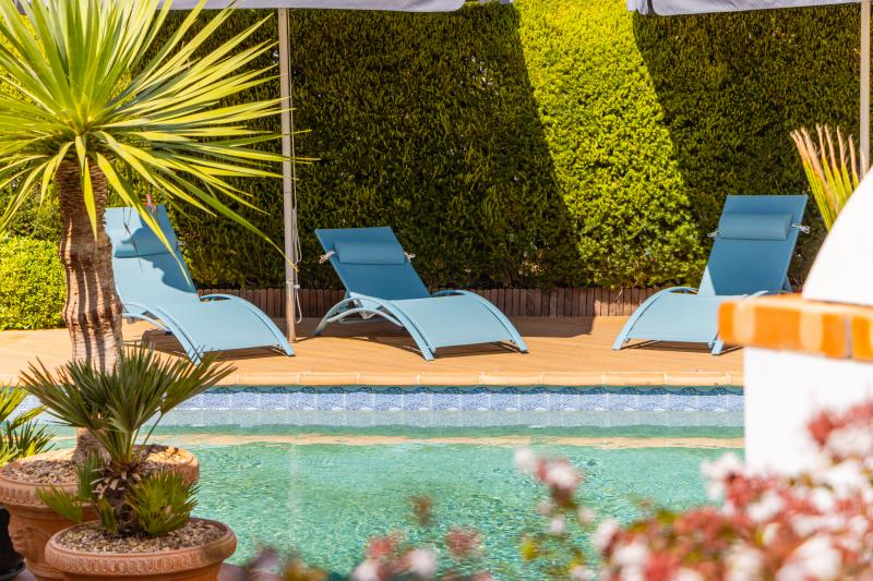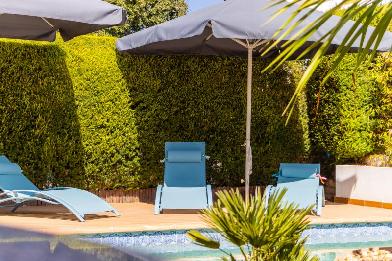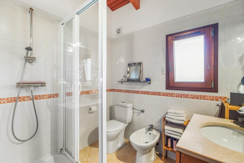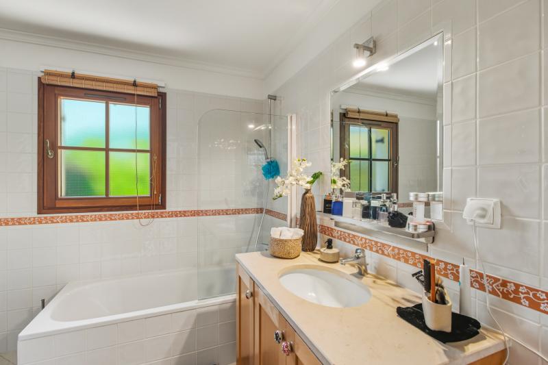 Les trois chambres disposent de placards intégrés. Deux d’entre elles sont en suite et donnent un accès direct à la terrasse de la piscine, tandis que la troisième, actuellement utilisée comme bureau, est desservie par une salle de bains familiale avec baignoire. Chaque salle de bains bénéficie d’un chauffage au sol.