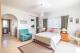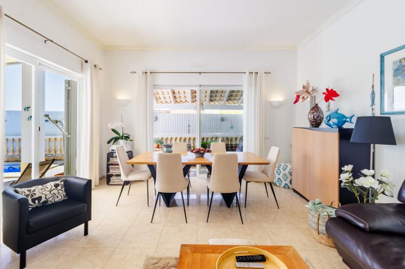 Från hallen når du också det fullt utrustade köket och en rymlig matsal, båda med direkt tillgång till poolområdet.