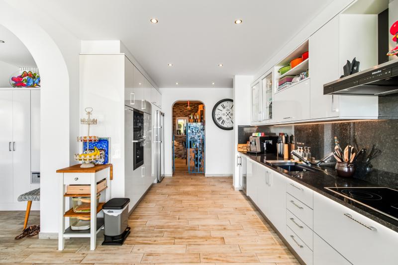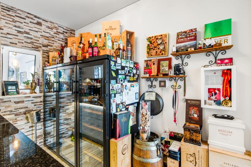 På bottenvåningen välkomnas du av ett stort, modernt kök utrustat med premiumapparater från Miele och en intilliggande vinkällare. Det rymliga vardagsrummet öppnar direkt mot terrassen med utsikt över det vackra poolområdet. Denna våning har även ett sovrum, ett badrum, kontor, tvättstuga, förvaringsutrymme och ett annex som kan användas som spelrum eller konferensrum.