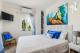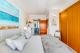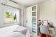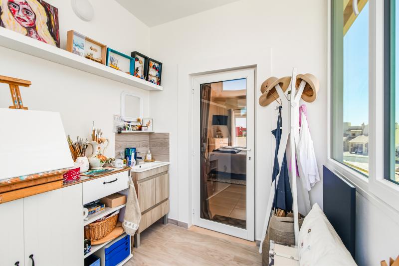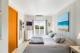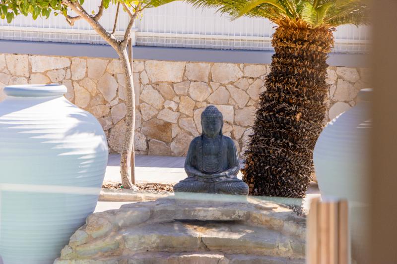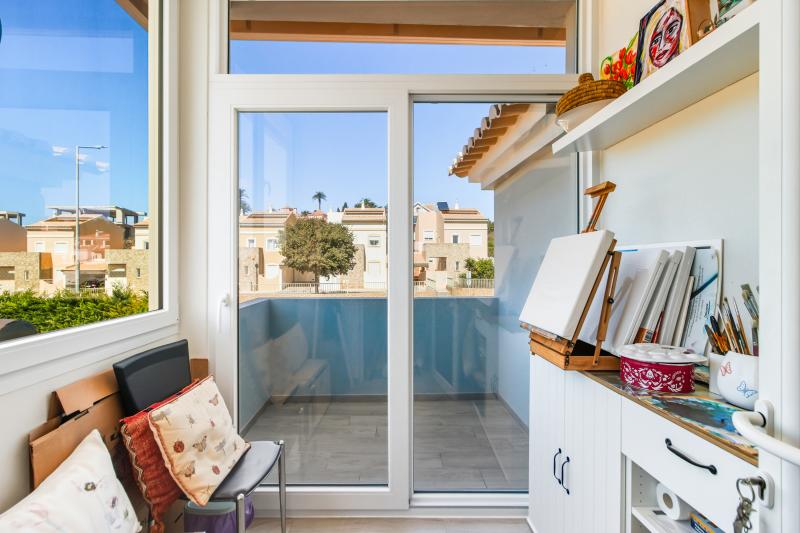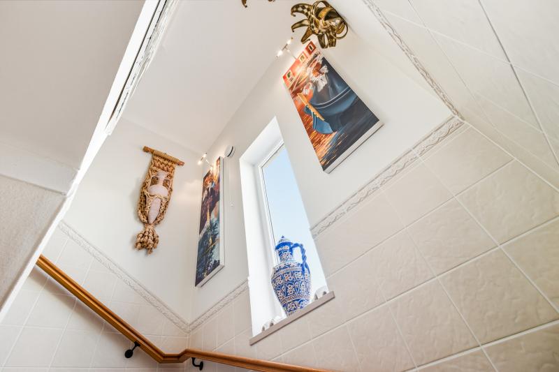 På övervåningen finns tre sovrum, inklusive master suite och det andra sovrummet, båda med privata balkonger med härlig utsikt över trädgård, pool och hav. Master suite har ett stilfullt badrum med ett inbjudande badkar. En charmig inbyggd balkong, som för närvarande används som konstnärsateljé, bidrar till husets karaktär.