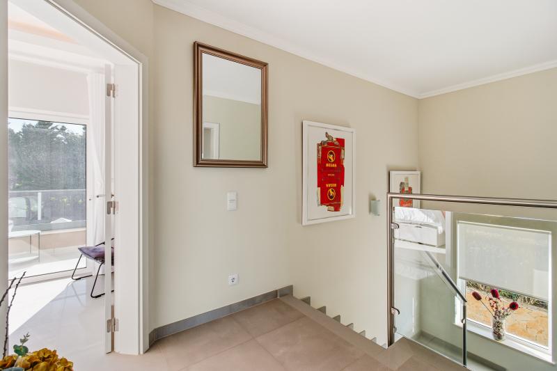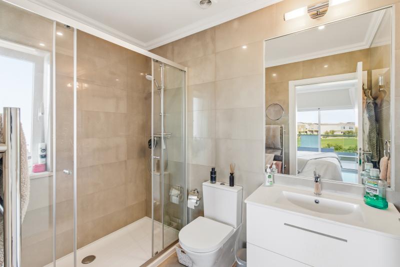 På övervåningen finns tre rymliga sovrum med egna badrum, utformade som privata oaser. Stora fönster släpper in rikligt med dagsljus och erbjuder rofylld utsikt över golfbanan och det omgivande landskapet.