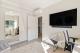 På samma plan finns ett flexibelt rum som kan användas som gästrum, hemmakontor eller gym, tillsammans med ett modernt familjebadrum. En stilren etanolspis bidrar till en varm och trivsam atmosfär.