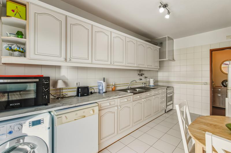 Alldeles intill matplatsen finns ett generöst tilltaget kök med plats för ett frukostbord och stolar och direkt tillgång till samma terrass. Intill köket finns ett mycket praktiskt skafferi/förråd, perfekt för extra förvaring.