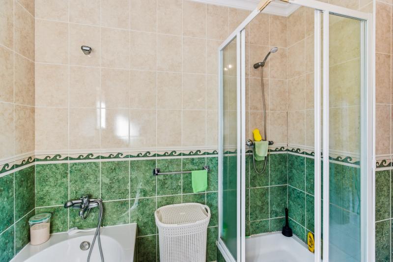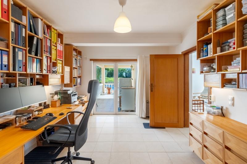 La villa se développe sur deux niveaux. Au rez-de-chaussée, le hall d’entrée mène à un vaste espace de vie ouvert avec salon, salle à manger et cuisine, bénéficiant d’un accès direct au jardin et à la piscine, dans un environnement très privé. Ce niveau comprend également deux chambres, dont une spacieuse suite (actuellement utilisée comme bureau), avec une salle de bain équipée d’une baignoire et d’une douche à l’italienne. Une seconde chambre et une salle de bain avec douche complètent cet étage, un réel atout pour éviter les escaliers au quotidien ou créer des espaces de vie indépendants.